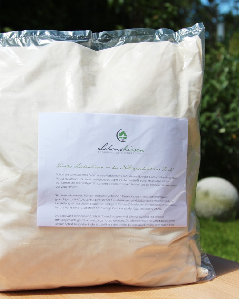 ein Naturprodukt aus Tirol. Verarbeitet wird ausschließlich heimisches Zirbenholz. Dies wird zum richtigen Mondzeitpunkt geschlagen und luftgetrocknet. Eine speziell für Zirbenholz entwickelte Hobeltechnik ermöglicht die Herstellung von besonders harzreichen und gut duftenden Zirbenflocken.